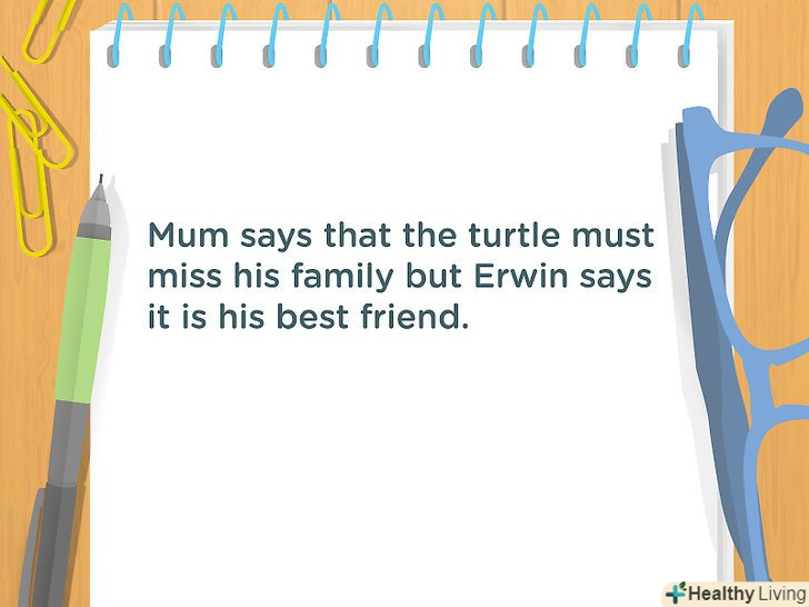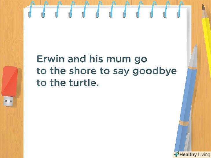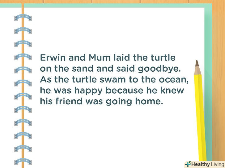 Завершіть розв'язкою. Розв'язка закінчує історію. Вона розповідає читачеві, чи досяг успіху головний герой або ж не досяг своєї мети. Можливо, ваш головний герой отримає бажане. Або піде на компроміс.- Наприклад, у вас може бути така розв'язка: Фіона і її мама знаходять черепаху в озері і разом дивляться, як вона спливає.
