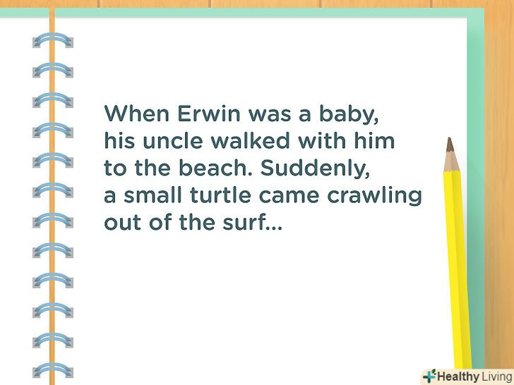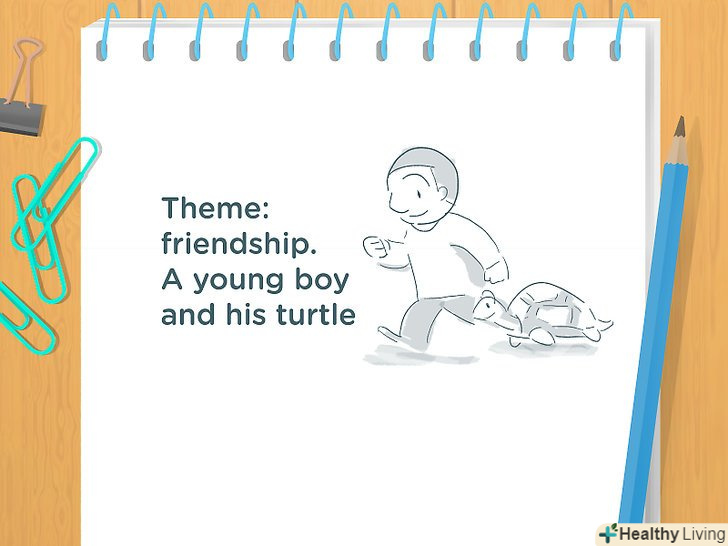 Виберіть тему або ідею для історії.наявність центральної теми в оповіданні допоможе вам генерувати ідеї. Зосередьтеся на таких варіантах, як любов, втрата, самобутність або дружба з точки зору дитини. Подумайте, як дитина може дивитися на цю тему і досліджувати її.[3]- Наприклад, можна вивчити тему дружби, акцентувавши увагу на відносинах між маленькою дівчинкою і її домашньої черепахою.