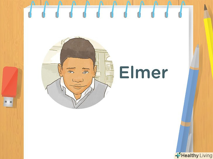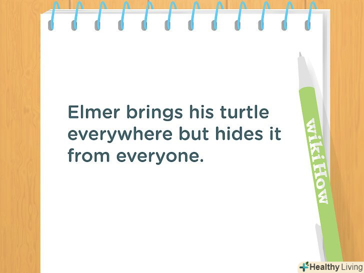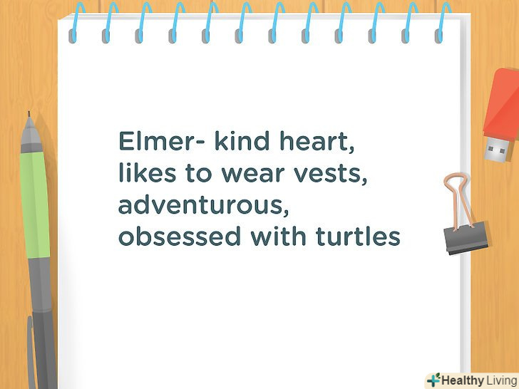 Наділіть головного героя парою-трійкою відмінних рис.Примусьте персонажа виділитися для читачів, наділивши його унікальними фізичними даними, наприклад, певною зачіскою, особливою манерою одягатися або відмінною ходою. Можна також обдарувати його такими рисами характеру, як добре серце, любов до пригод або схильність потрапляти в неприємності.[5]- Наприклад, у вас може бути головна героїня, яка завжди заплітає довге волосся в косички і одержима черепахами. Або у неї буде виразний шрам на руці з того моменту, як вона впала з дерева.