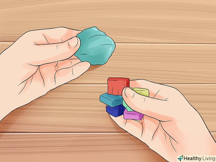 Скомпонуйте кольору, як вам хочеться.якщо ви і так задоволені кольором, ви можете пропустити цей крок. Якщо ви хочете змінити кольори, зараз саме час.- Змішувати глину різних кольорів досить просто. Відщипніть порції глини двох або більше кольорів і об'єднайте в одну кулю. Скачуйте і замішуйте цю кулю до тих пір, поки кольори не зіллються рівномірно.