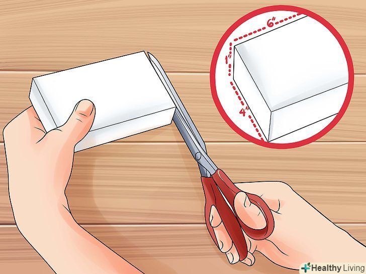 Вирізання потрібних розмірів губки.скористайтеся парою великих, гострих, важких ножиць, щоб вирізати з меламінової губки форму, яку можна буде легко тримати в руці. Точні розміри-це справа смаку, але, як правило,блок 15 см в довжину, 10 см в ширину і товщиною 2,5 см буде в самий раз.- Якщо вам важко розрізати меламінову губку ножицями, спробуйте зробити це гострим ножем.
