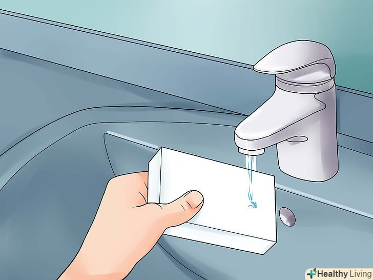 Змочіть губку водою.користуйтеся теплою водою з-під крана або розпилювача, щоб злегка змочити меламін. Губка не повинна бути мокрою, але поверхня, яку ви збираєтеся відтирати, повинна бути злегка вологою.- Вода взаємодіє з пористою губкою таким чином, що ви можете використовувати її в якості наждачного паперу. Без води, ластик може бути занадто жорстким для використання проти плям.