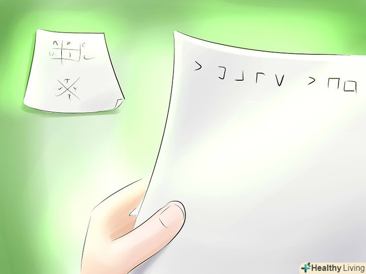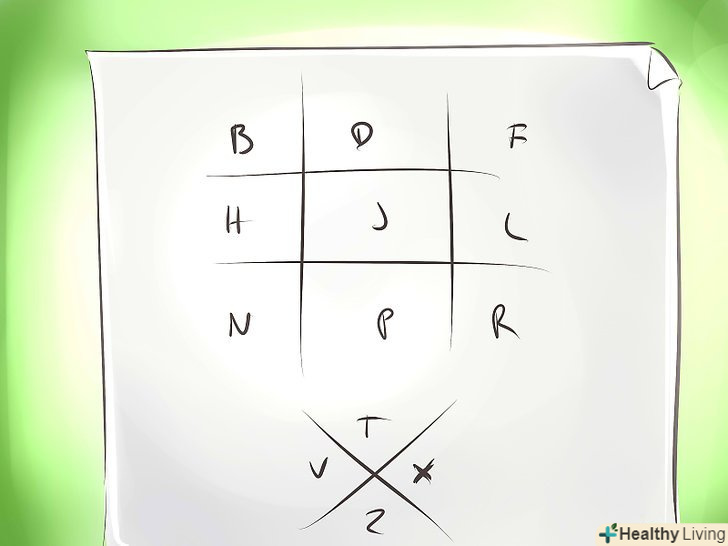 Розставте букви по осередках. Дані фігури мають осередки між лініями. Заповніть ці комірки двома літерами алфавіту. Розміщуйте букви хаотично і не використовуйте одну і ту ж букву двічі.- Будь-який адресат повідомлення буде повинен мати таку ж копію основи шифру з буквами, для того щоб прочитати ваше повідомлення.