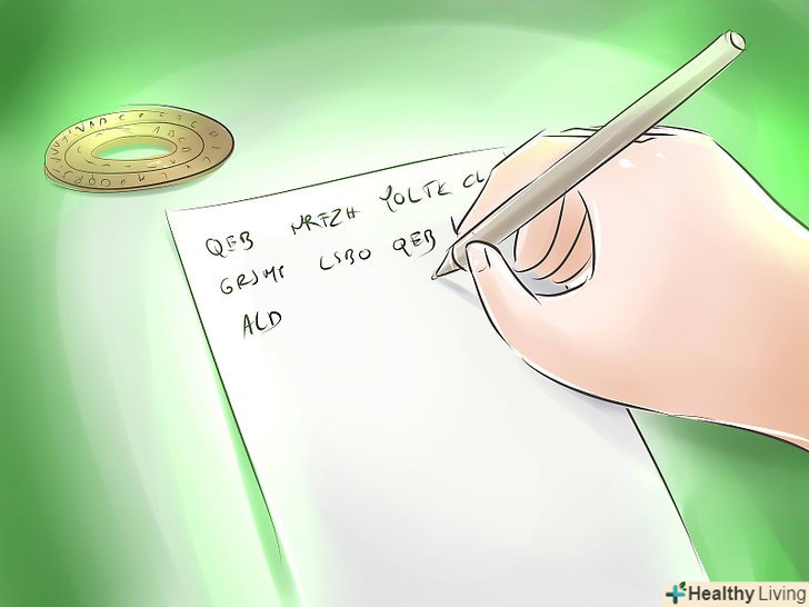 Переведіть ваше повідомлення.коли хтось захоче прочитати ваше повідомлення, все, що йому треба буде знати, так це яку дату ви використовували для кодування. Для перекодування скористайтеся зворотним процесом: напишіть цифровий код, потім поверніть букви в протилежному порядку.- Кодування за допомогою дати має додаткову перевагу, так як дата може бути абсолютно будь-який. Ви також можете змінити дату в будь-який момент. Це дозволяє оновлювати систему шифру набагато легше, ніж при використанні інших методів. Як би там не було краще уникати таких відомих дат як 9 травня 1945 року.