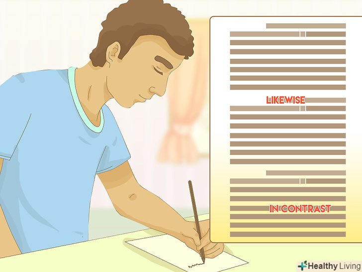 Використовуйте сполучні слова та речення. щоб есе було легко читати, використовуйте слова і фрази, які будуть пов'язувати частини тексту в одне ціле. Починайте абзаци зі слів" в той же час "або" на відміну від...".[13]- Допоміжні слова роблять текст більш логічним. Наприклад, фраза "незважаючи на численні переваги, у цього закладу багато мінусів, які не дозволяють йому стати кращим кафе в місті", дасть читачеві зрозуміти, як цей абзац пов'язаний з попереднім.