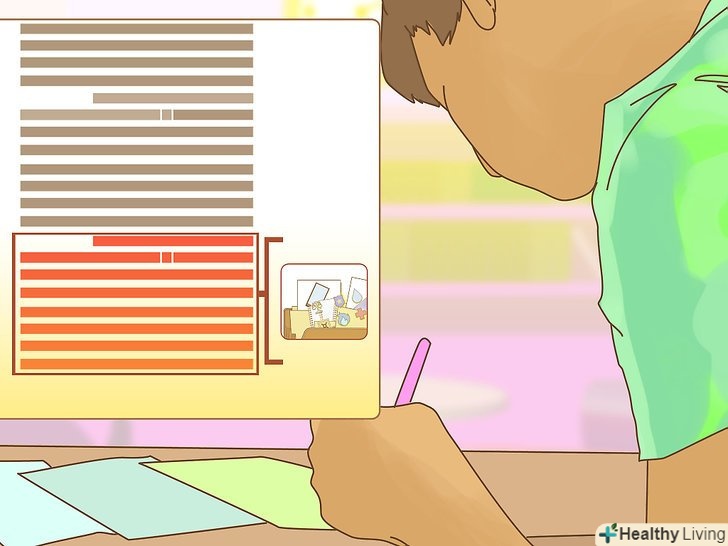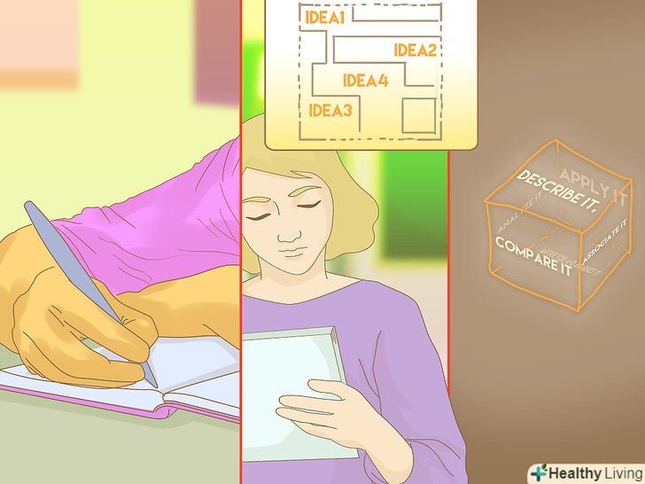 - Запишіть ключову думку, обведіть її в коло і напишіть навколо інші думки, пов'язані з цією темою. Пошукайте зв'язки між ними і об'єднайте їх.[9]