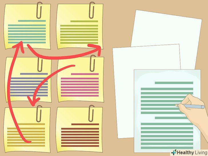 Розділіть текст по абзацах.якщо ви не можете визначити, в якому порядку краще розташувати абзаци, роздрукуйте есе і розріжте його на шматки. Спробуйте з'єднувати абзаци в різному порядку. Чи Стало так краще?- Можна використовувати цей прийом і з ключовими реченнями, якщо переходи між абзацами виглядають непереконливими. В ідеалі у кожного абзацу повинен бути тільки один варіант попереднього і наступного абзацу. Якщо ви можете скласти абзаци в будь-якому порядку і текст все одно буде читаним, ви напевно щось робите не так.