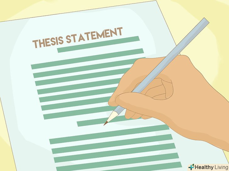 НапишітьТезу.теза повинна бути вашим особистим наглядом. Це може бути сильне твердження, інтерпретація певної роботи або події або будь-яке інше висловлювання, яке не буде відображати загальновідому істину або підсумувати сказане в іншій роботі.[6][7]- Теза буде опорною точкою вашої роботи. Він дасть вашим читачам зрозуміти, про що піде мова в есе.