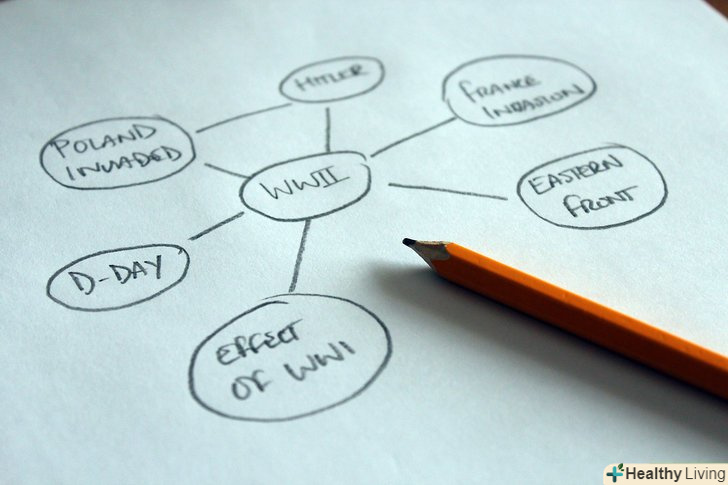 Обмірковуйте свої ідеї.як тільки ви зберете достатньо матеріалу для есе, гарненько проаналізуйте все, що вам вдалося зібрати, знайдіть зв'язок між усіма поняттями.[2]- Намалюйте свої ідеї! У центрі листка паперу намалюйте коло, а в ньому назва теми. Поруч запишіть найбільш важливі ідеї і пункти. З'єднайте ці ідеї стрілками, щоб відобразити порядок, в якому ці ідеї будуть розташовуватися в тексті. Потім до кожної ідеї додайте кілька деталей.