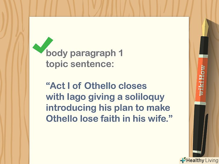 Починайте кожен абзац з тематичного речення.тематичне речення повідомляє головну ідею абзацу і прямо співвідноситься з тезою. Всі інші речення підкріплюють тематичне речення абзацу. Складіть тематичні пропозиції для основних абзаців на основі свого плану.[10]- Розглядайте тематичні речення як міні-тези, щоб абзаци стосувалися лише конкретного аспекту теми.