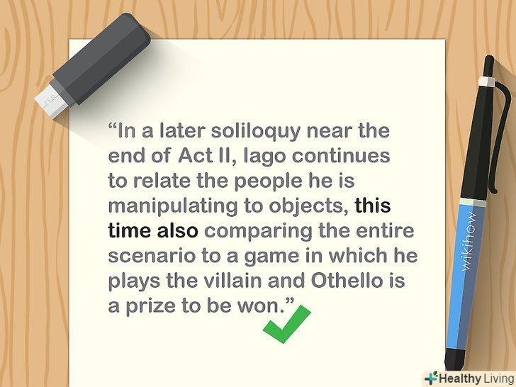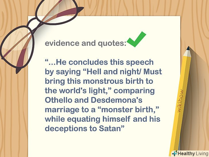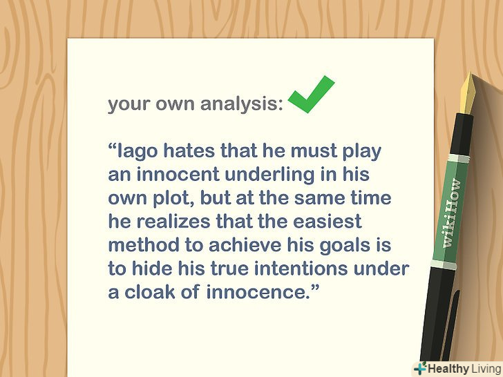 Надайте власний аналіз фактів.Зв'яжіть цитати з темою есе, щоб читач чітко розумів, що ви хочете сказати. Не слід вважати, що читач сам встановить зв'язок між тезою і запропонованою інформацією. Також аналіз дозволить викласти власні думки і варіанти тлумачення фактів.[12]- Якщо не стоїть завдання написати особисте есе, то не використовуйте пропозиції від першої особи, інакше ваша робота буде виглядати менш професійною і достовірною.