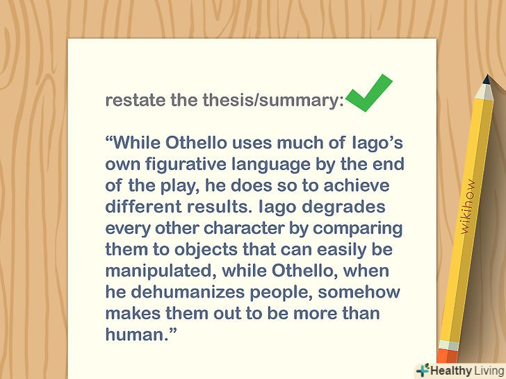 Коротко повторіть тезу і підсумуйте доводи.Нагадайте читачам основну ідею твору і запропоновані доводи. Не повторюйте тезу слово в слово. Змініть формулювання і перепишіть тематичні пропозиції іншими словами. Це допоможе читачеві краще запам'ятати аргументи з есе.[14]- Наприклад, якщо теза була "мобільний телефон — головний винахід останніх 30 років", то на закінчення сформулюйте його так: "мобільний телефон можна назвати важливим винаходом в історії людства, оскільки він дає можливість зв'язатися з людьми в будь-якій точці земної кулі і легко отримувати доступ до інформації".