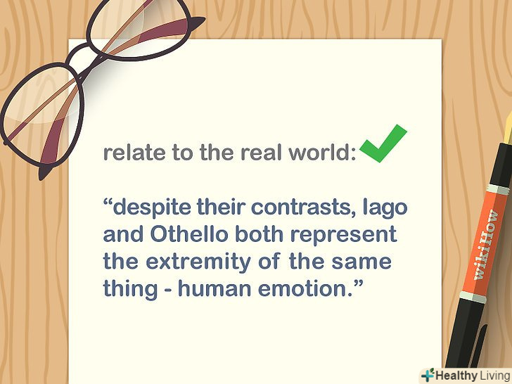 Розгляньте актуальність теми вашої роботи. Зв'яжіть ідею твору з реальним світом. Як читач може використовувати таку інформацію в реальному житті? Це покаже, чому ваше есе виходить за рамки запропонованого вчителем завдання.[15]- Наприклад, якщо в есе ви розглядаєте теми твору, то подумайте, як вони впливають на життя сучасних людей.
