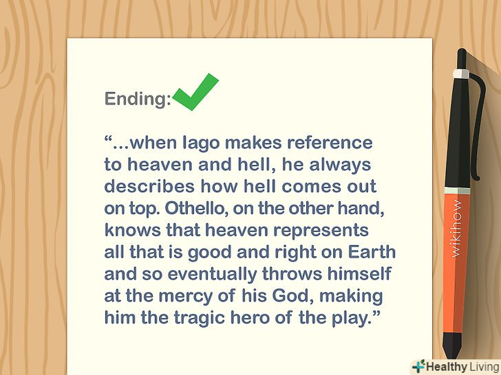 Завершіть абзац незабутньою деталлю, яка зв'яже весь текст воєдино.в кінці твору можна вказати факт, привести цитату або задати питання. Зв'яжіть його з введенням, щоб зробити есе повноцінним самодостатнім текстом і завершити розпочату тему.[16]- В кінці використовуйте пропозицію такого ж типу, як і перша фраза, якою ви привертали увагу читача.