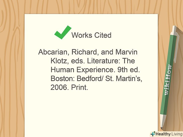 При необхідності складіть список використаної літератури.уточніть необхідність або формат списку літератури у свого вчителя. Вкажіть використані джерела на окремій сторінці в кінці твору. Розташуйте їх в алфавітному порядку за прізвищами авторів і не забувайте використовувати правильний формат посилань в залежності від стилю вашого есе.[17]- Список використаної літератури продемонструє, що ви керувалися не тільки своїми домислами, а читач зможе пізніше ознайомитися з вихідними матеріалами.