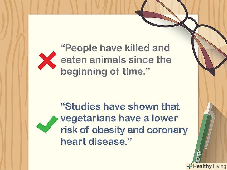 ШукайтеДостовірні джерела на підтримку своїх доводів.не використовуйте особисті блоги та упереджені сайти. Дослідіть наукові статті, загальні джерела новин і лабораторні дослідження, щоб зібрати найбільш точні відомості. Також шукайте книги великих видавництв, які можуть підкріпити ваші доводи.[4]- Зверніться до шкільного бібліотекаря, щоб дізнатися про конкретні книги або бази даних, в яких можна знайти цікаві для Вас відомості.