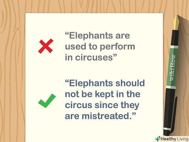Сформулюйте доказову тезу.він являє собою точку зору, яку Ви викладаєте читачам, а також основну ідею всього есе. Якщо потрібно використовувати довід, уявіть його одним чітким і лаконічним пропозицією. Переконайтеся, що навколо вашого твердження можна вести дискусію. Не використовуйте загальні ідеї або поняття.[3]- Наприклад, твердження "слони часто виступають в цирку" не вимагає доказів і суперечок. Замість цього краще написати:"у цирку погано поводяться зі слонами, тому вони повинні жити на волі". Це дозволить знайти вагомі аргументи і наштовхнути читача на зустрічні аргументи.