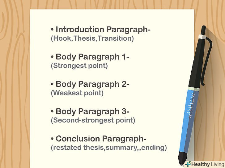 СкладітьПлан абзаців вашого есе.часто есе слідують звичайній структурі з п'яти абзаців: вступний абзац, три основні абзаци і висновок. Зберіть інформацію для тези і доводів, а потім упорядкуйте абзаци з логічними переходами. Для кожного основного абзацу слід використовувати хоча б 2-3 підпункту з доказами та іншими конкретними відомостями з вашого дослідження.[5]- Кількість пунктів і деталей в плані залежить від обсягу майбутнього твору. У великому есе буде більше основних абзаців з доказами на підтримку тези.