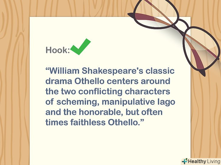 Зацікавте читача доречним фактом, цитатою або питанням в першому реченні. Потрібно привернути увагу до вашого есе. Використовуйте вражаючу статистику або гіпотетичне питання, щоб читач задумався про дану тему. Необхідно, щоб такий аспект був пов'язаний з темою Вашого твору і став прологом до тези.[6]- Інформація або цитата повинна бути точною і не перебільшувати реального стану речей, інакше читач буде сумніватися в правдивості всього тексту.