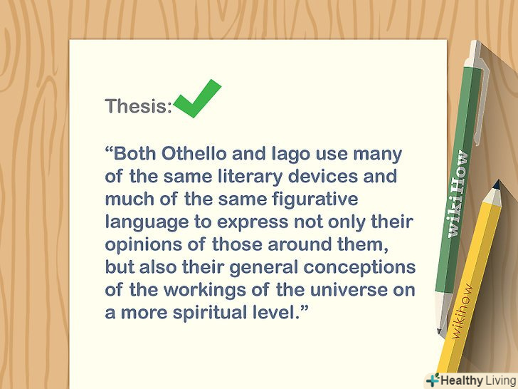 Сформулюйте тезу в одному реченні.після цікавого факту вкажіть мету твору, щоб читач розумів головну тему. Теза повинна чітко і лаконічно демонструвати вашу думку по темі.[7]- Наприклад," у найближчі п'ять років ми повинні позбутися залежності від викопного палива, оскільки льодовикові шапки на полюсах Землі тануть через глобальне потепління "або"ароматизований тютюн цікавий в першу чергу дітям і підліткам, тому потрібно заборонити продаж таких продуктів на законодавчому рівні".