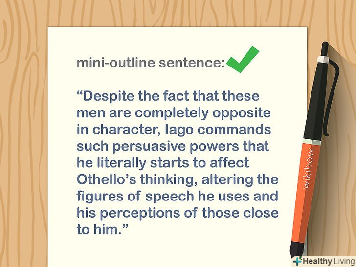 Складіть речення з коротким викладом тем, які будуть розглянуті в есе.коротко викладіть інформацію, яка буде використовуватися в якості доводів. Це допоможе читачеві чітко розуміти характер і рамки дискусії.[8]- Основною такого короткого викладу повинні стати головні теми основних абзаців.