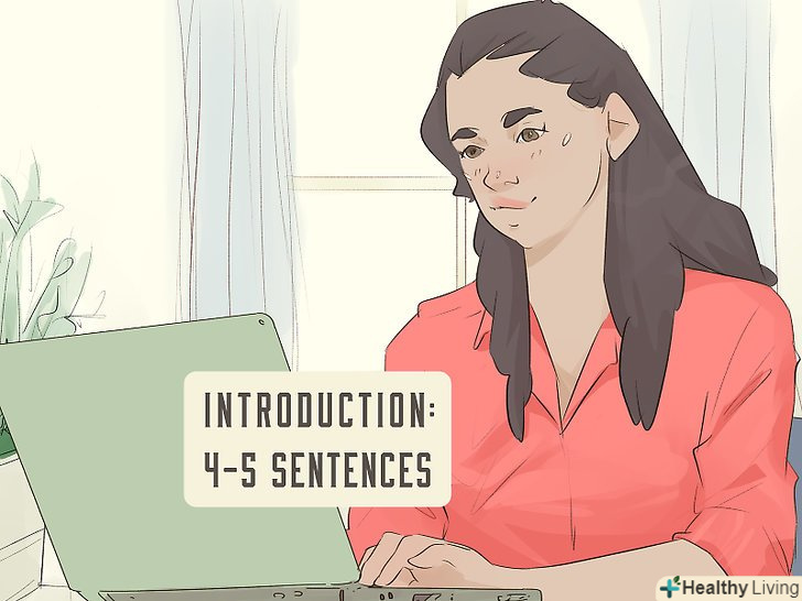 Обсяг введення не повинен перевищувати 4-5 пропозицій.у вступі не потрібно підводити підсумок всьому твору або повідомляти занадто багато загальних відомостей. Прибережіть важливі відомості для основних абзаців. Розглядайте перший абзац як простий вступ до основної частини есе.[9]