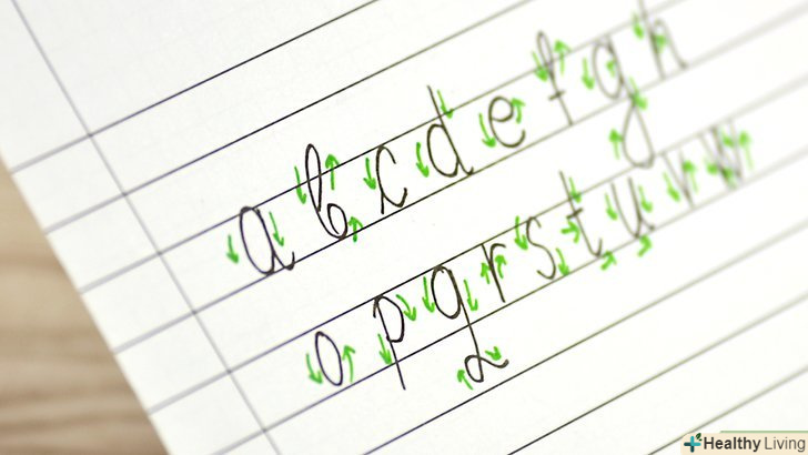 Подивіться, як пишеться кожна буква (в прописах або в Інтернеті).хоча кожна людина пише по-своєму, є абсолютно конкретний спосіб написання кожної букви алфавіту. Дотримуючись правильної інструкції з написання кожної букви, ви значно поліпшите почерк в цілому. Наприклад, замість того щоб починати писати букву «б» з верхнього хвостика, починайте її з внутрішньої петлі. Потренуйтеся в правильному написанні кожної букви, як ви робили це в дитячому садку або школі.