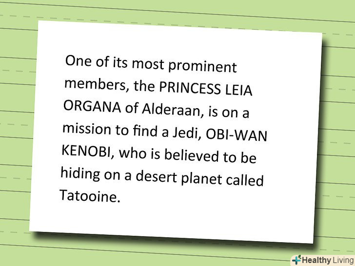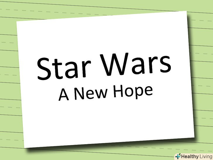 Подумайте, яка назва найкраще підходить для вашої історії.постарайтеся зробити його цікавим і інтригуючим, але не надто старайтеся, оскільки більшість директорів студій і режисерів змінюють робочу назву. Назву потрібно помістити вгорі першої сторінки.- Під назвою вкажіть жанр фільму (бойовик, любовна комедія, трилер і так далі).