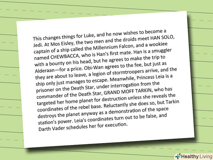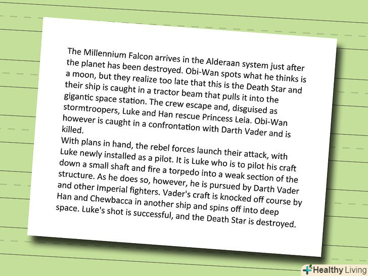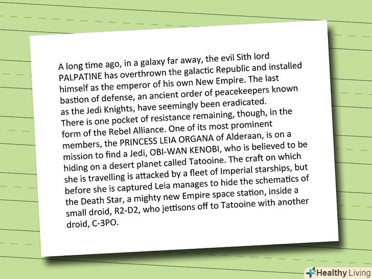 Напишіть зведення. це резюме всього сценарію, складене максимум з двох пропозицій. Можете порівняти зведення з описом (дескрипшн) інтернет-сторінки або текстовим повідомленням про зміст наступної передачі на телебаченні.- При бажанні після зведення можна додати пропозицію, що розповідає, чим цікавий сценарій з точки зору кіноіндустрії. Наприклад, фільм можна зняти з невеликими бюджетними витратами на декількох майданчиках поблизу Лос-Анджелеса, і тому привабливіше зйомок, що вимагають багатотижневих відряджень в різні місця, спеціальних декорацій або великого обсягу комп'ютерної графіки.