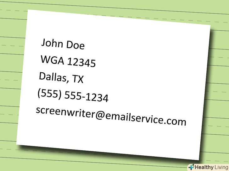 Додайте контактну інформацію та реєстраційний номер у Спілці кінематографістів, наприклад, у США це Writers Guild of America (WGA).Зареєструйте сценарій у WGA, щоб захистити авторські права, використовуючи весь авторитет асоціації.