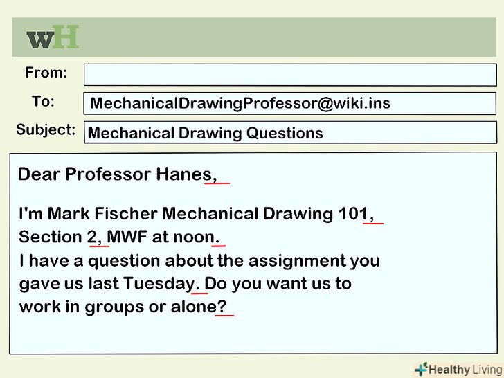 Не забувайте про правильну пунктуацію.у листі другу не страшно де-небудь пропустити кому або крапку. Проте, коли ви пишете викладачеві, переконайтеся в тому, що всі належні знаки пунктуації стоять на своїх місцях.[9]