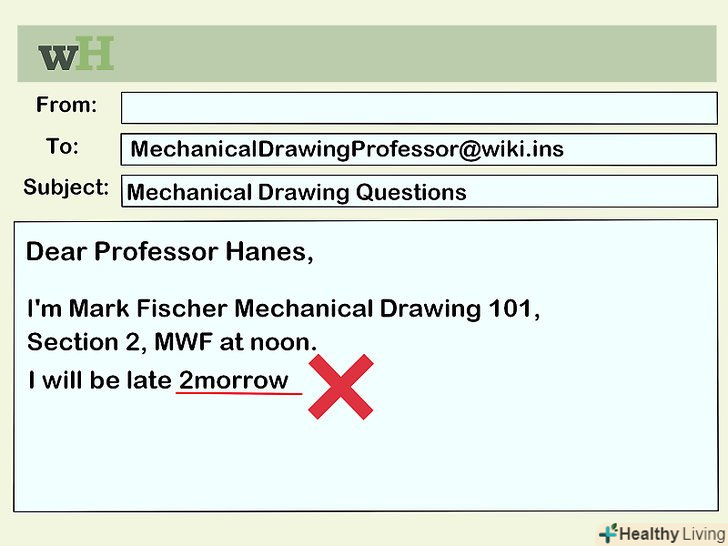 Не скорочуйте слова.незважаючи на те, що словесні скорочення просто заполонили Інтернет, в професійних листах їм не місце. Наприклад, не використовуйте "д/з" замість "домашнього завдання" або "лабу" замість "лабораторної роботи". Користуйтеся повноцінними словами.[10]- Також не забудьте прогнати текст листа через перевірку орфографії.