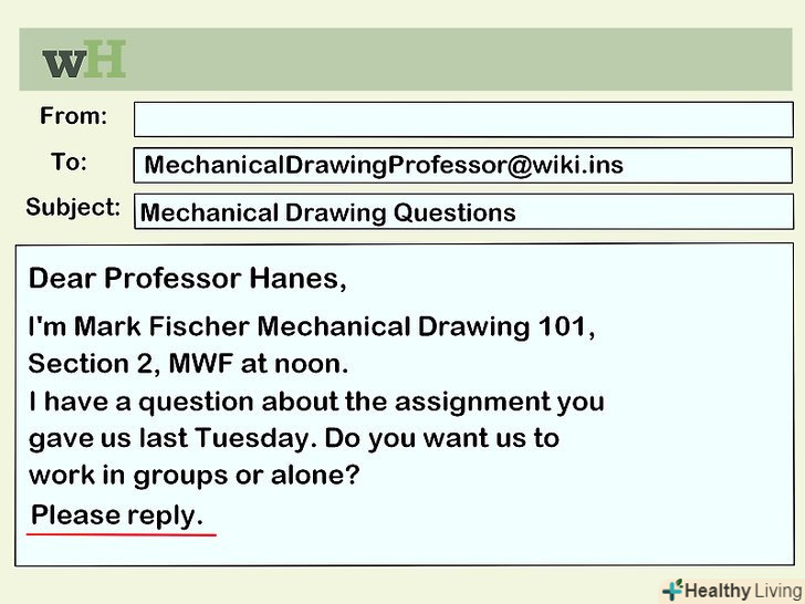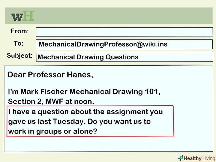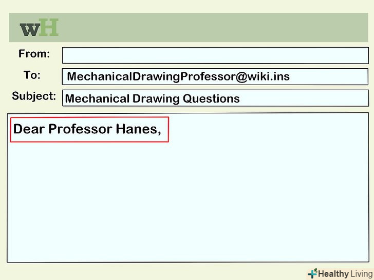 Створіть зрозумілий заголовок в темі листа.тема листа дасть викладачеві натяк на те, про що піде мова в самому листі, ще до того, як він його відкриє. Це буває досить корисно, так як людині може знадобитися деякий час, щоб приділити увагу саме цій темі. Простежте за тим, щоб заголовок вашого листа був зрозумілим і точно відображав його суть.[3]- Наприклад, можна вказати в темі таку фразу, як: "питання за поточним завданням", — або: "підсумкове есе".