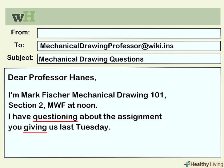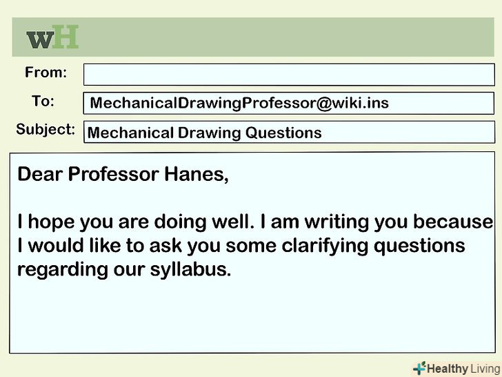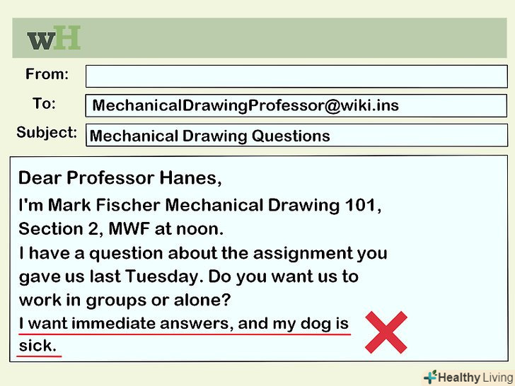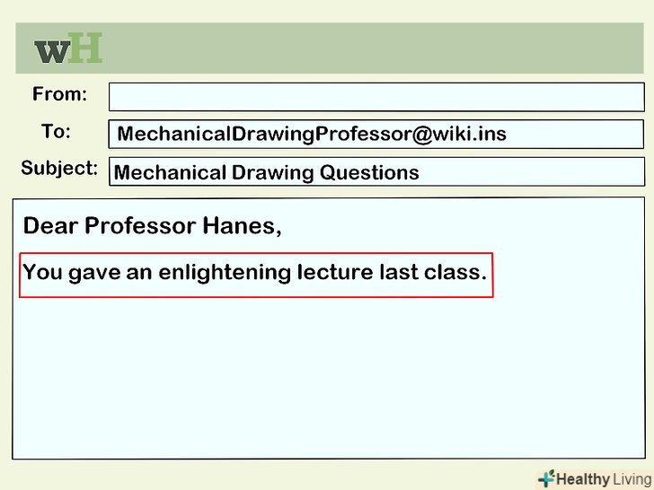 Слідкуйте за тоном листа.коли ви вперше пишете викладачеві, стежте за тим, щоб тон і стиль вашого письма були професійними. Це означає повну відмову від емоцій! Коли по ходу семестру листування з викладачем стане більш-менш усталеною, можна буде трохи розслабитися. Це допустимо в тому випадку, якщо викладач сам допускає менш формальний стиль спілкування (наприклад, використовує смайлики в листах до вас).