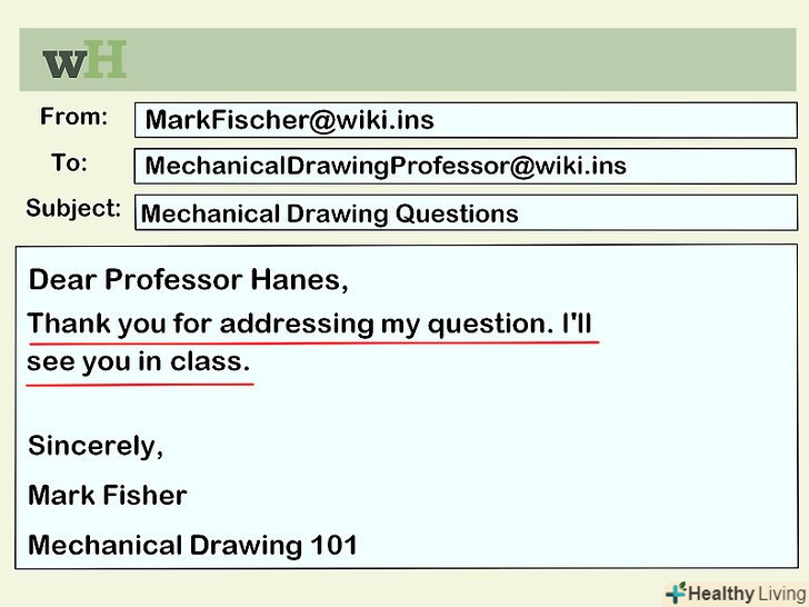Підтвердіть отримання відповіді.отримавши відповідь, дайте викладачеві про це знати. Простого "Спасибі!"зазвичай цілком достатньо. Якщо потрібно, трохи Розширте свій лист, користуючись тими ж самими рекомендаціями, щоб все виглядало професійно. Якщо ваша проблема (або питання) не знайшла адекватної відповіді в листі викладача, попросіть про особисту зустріч.- Наприклад, можна написати: "спасибі за відповідь на моє запитання. До зустрічі на заняттях!"