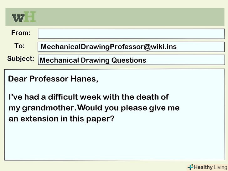 Ввічливо звертайтеся з проханнями.багато студентів намагаються вимагати щось від викладачів. Це тупиковий підхід. Замість цього будуйте свої фрази як прохання, які викладач може як задовольнити, так і ні.[8]- Наприклад, можливо, ви хочете отримати відстрочку по курсовій роботі. Не кажіть:"у мене померла бабуся, дайте мені відстрочку по курсовій". Краще напишіть: "у мене видався важкий тиждень через смерть бабусі. Не могли б ви мені дати невелику відстрочку у виконанні курсової роботи?"