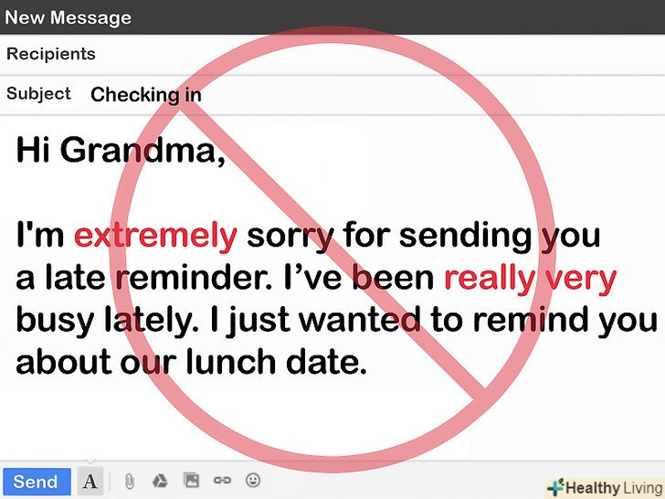 Видаліть непотрібну інформацію.задумайтеся, наскільки необхідно кожне речення або навіть конкретне слово. У деяких ситуаціях " необхідність "може мати широке значення на кшталт:"Це необхідно, щоб лист не здалося холодним". Видаліть з листа всі непотрібні слова і фрази.[8]- Можна безболісно видалити прислівники ("дуже"," точно"," сильно"," неймовірно"," вельми"), щоб зробити лист більш лаконічним.[9]