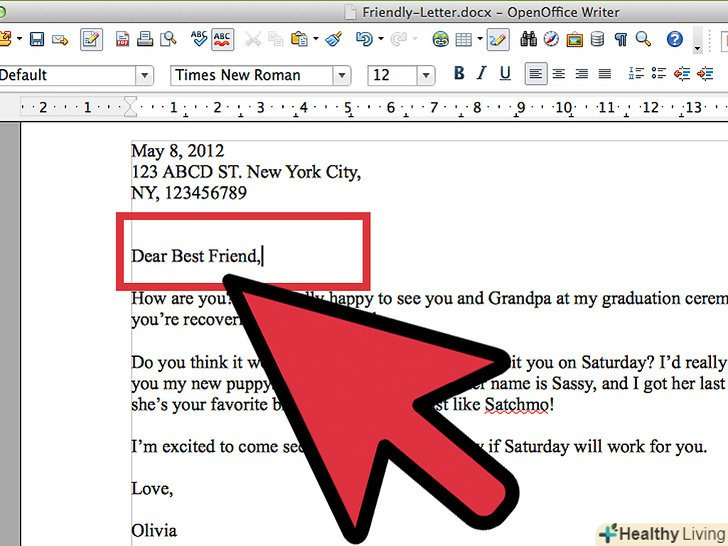 - Залиште порожній рядок між привітанням і датою, а також між привітанням і основним текстом.