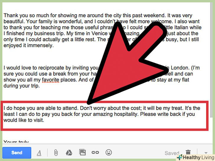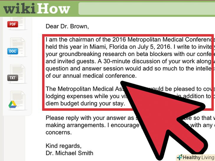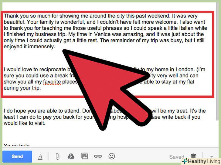 У тексті листа напишіть введення, тіло і висновок. введення і висновок повинні складатися тільки з одного короткого пункту, але основна частина, як правило, значно більше.- Основний текст листа вирівняйте по лівому краю.