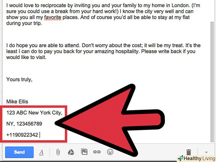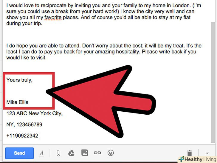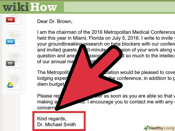 Поставте свій підпис.поставте свій підпис прямо під висновком. Зазвичай ім'я пишуть прописом, а не друкують.- Якщо ви з одержувачем звертаєтеся один до одного по імені, ви можете написати в підписі тільки своє ім'я. Якщо одержувач може не впізнати вас тільки по імені, не забудьте включити своє прізвище.
