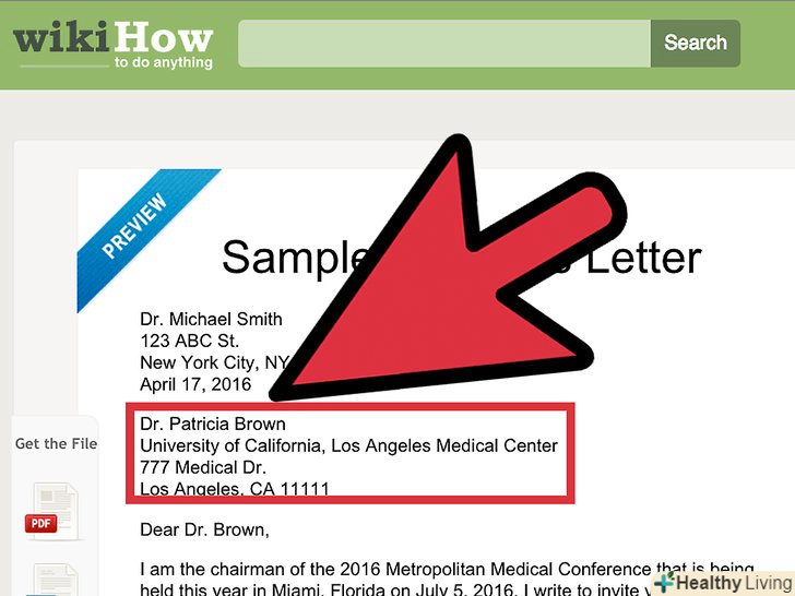 Вкажіть адресу одержувача.додайте ім'я та посаду одержувача, а також назву компанії, адресу, місто, регіон Та Поштовий Індекс.- Вся ця інформація повинна бути вирівняна по лівому краю з використанням одиночного міжрядкового інтервалу. Ім'я одержувача має бути написано на окремому рядку, так само як і його посада, назва компанії та адреса одержувача. Місто, область, регіон і поштовий індекс вкажіть в цьому ж рядку.