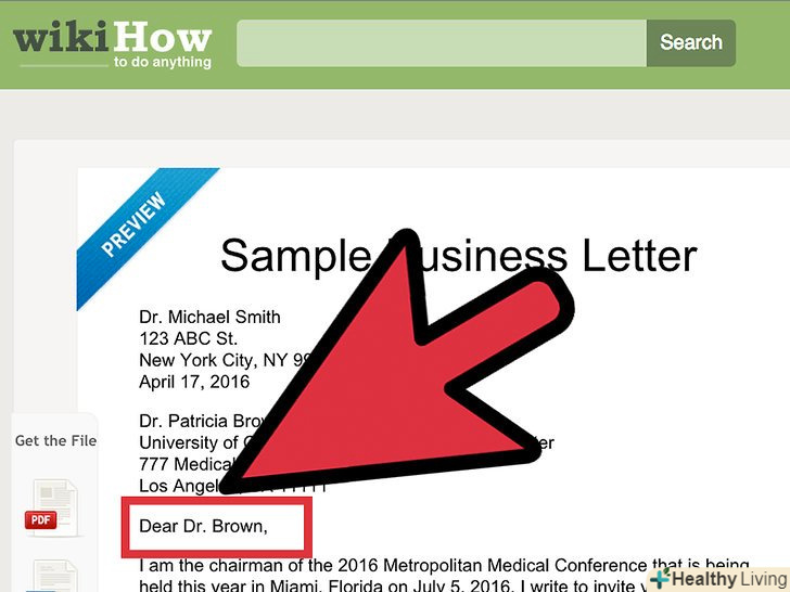 Увімкніть ввічливе привітання.незважаючи на те, що формат такого листа трохи спрощений, ви все одно повинні включити ввічливе привітання, яке починається з «Шановний (А)» і включає в себе ім'я одержувача і його по батькові.- Вирівняйте привітання по лівому краю.