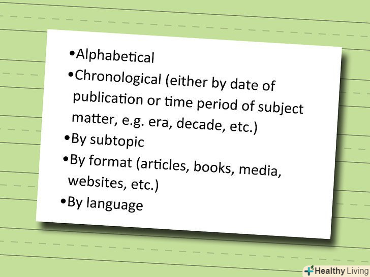 Робіть посилання відповідно до порядку.Вам адже потрібна якась система в роботі, в кінці кінців. Структуроване написання посилань допоможе читачам легше їх сприймати, а так само шукати джерела, якщо у них виникнуть будь-які питання. Уточніть, чи вважає за краще ваш викладач будь-якої певний метод; можливо він використовує один з наступних методів для організації посилань:- Алфавітний