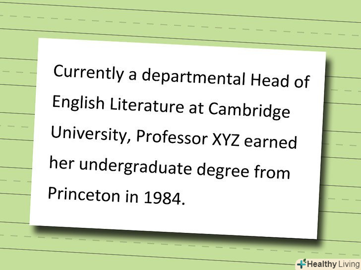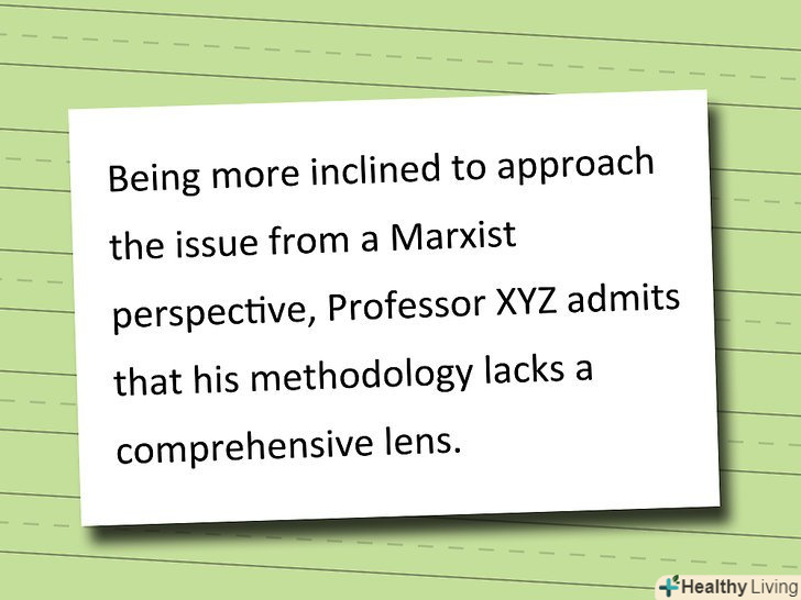 Включіть всі упередження або особливо важливі інтереси автора.корисно згадувати про пристрасті письменника, особливо якщо він визнає, що вони у нього є.- Приклад: "будучи більш схильним підходити до питання з марксистської точки зору, професор XYZ визнає, що його метод недостатньо вичерпний."