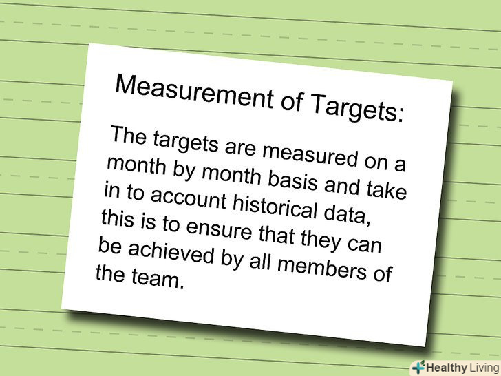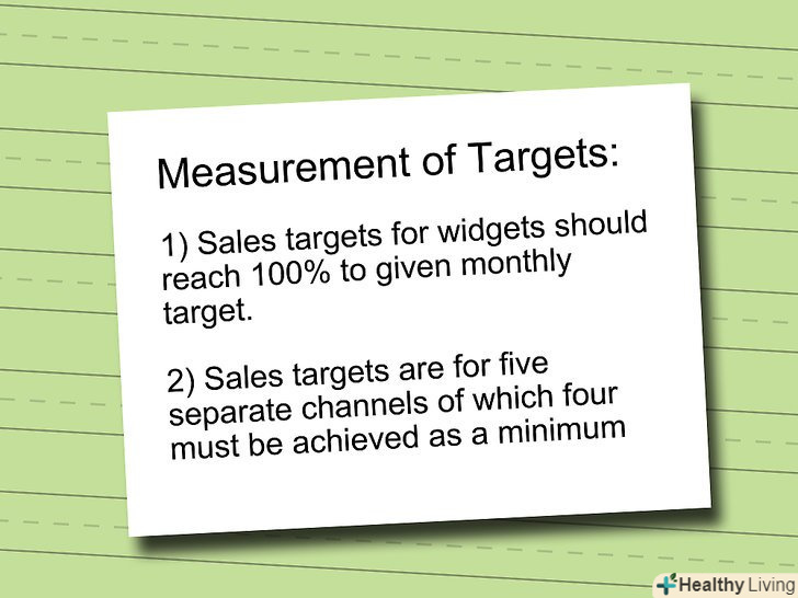 Зафіксуйте, як буде виміряно виконання кожного завдання.визначте спосіб, за допомогою якого можна дізнатися про досягнення мети. Наприклад, оцінка роботи співробітника, який відповідає за інструктаж з техніки безпеки, може бути виміряна шляхом підрахунку позовів працівників Компанії про компенсацію збитку, пов'язаного з безпекою. Від учня , чия мета-зрозуміти, як виростити рослину з насіння, можна очікувати виростити помідор від насіння до фрукта. Вибирайте такі цілі, чиї результати можна підрахувати.