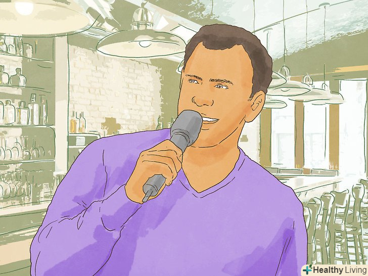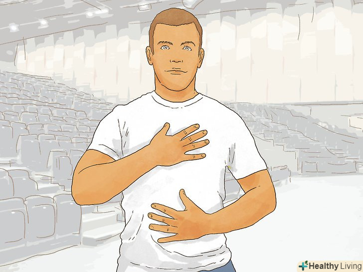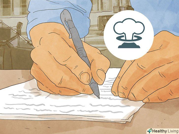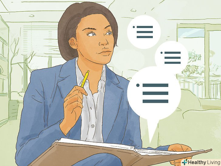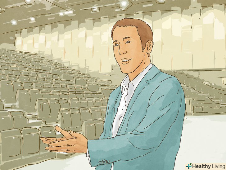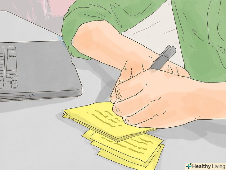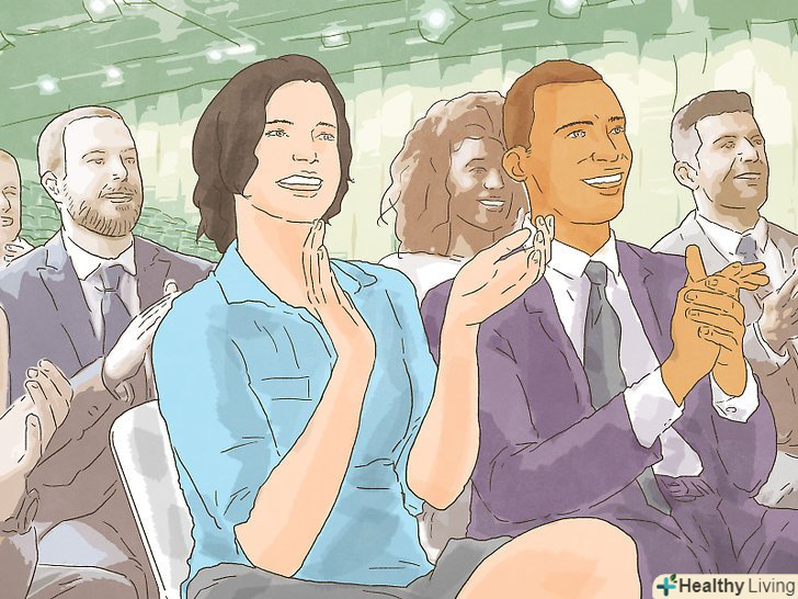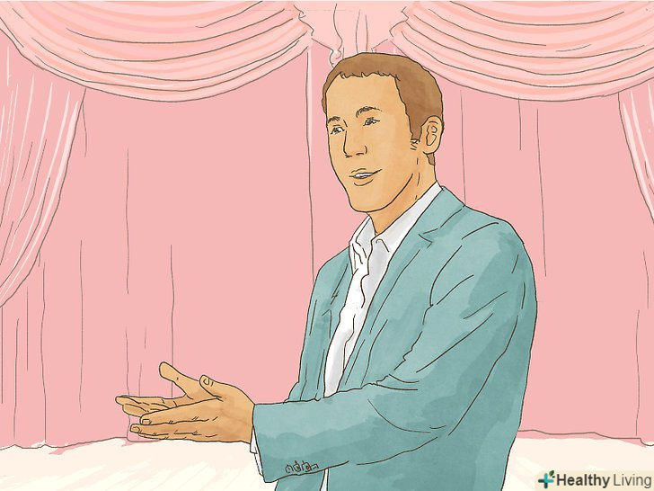 Розмовляйте з публікою.Ваша мова не повинна звучати як завчена таблиця множення.[24][25] постарайтеся створити видимість діалогу, нехай навіть говорите тільки ви. З цієї причини краще не використовувати мову у вигляді готового тексту і не намагатися запам'ятати його напам'ять (хоча б на самому початку). Намагайтеся використовувати замітки у вигляді маркованого списку, щоб не втрачати нитку виступу.- Якщо потрібно вимовити промову з трибуни або за столом, то доречіть свої записи на аркуші паперу або в блокноті, але не використовуйте картки. Мало хто може непомітно гортати картки і при цьому виглядати як професіонал.