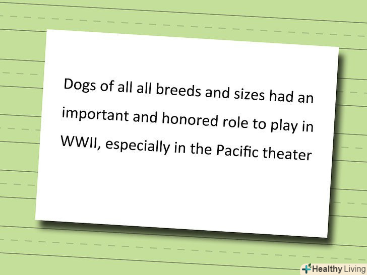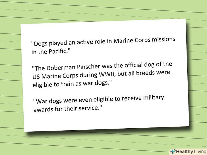 Зробіть висновок і перейдіть до наступного абзацу.в ідеалі кожен абзац повинен логічно переходити в наступний. Висновок кожного абзацу основної частини має підвести підсумок основної думки і в той же час показати, як вона пов'язана з вашою наступною думкою.- Наприклад, якщо ви включили абзац, що починається так: "Доберман пінчер був офіційною собакою Корпусу морської піхоти США під час Другої світової війни, але всі породи могли бути навчені як військові собаки" до абзацу, що починається так: "військові собаки насправді мали право на отримання військових нагород за свої послуги", ваша заключна фраза повинна поєднувати ідею зв'язку порід собак з отриманням бойових нагород.