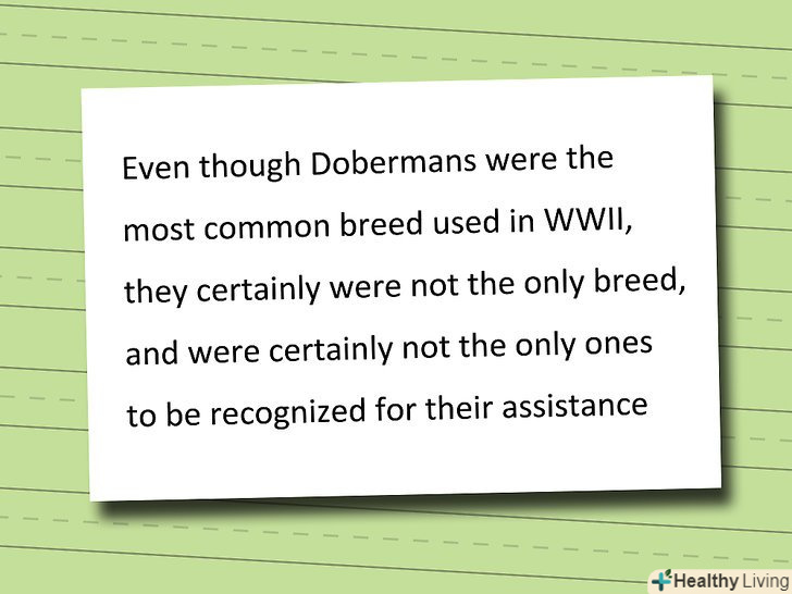 - Наприклад, якщо ви включили абзац, що починається так: "Доберман пінчер був офіційною собакою Корпусу морської піхоти США під час Другої світової війни, але всі породи могли бути навчені як військові собаки" до абзацу, що починається так: "військові собаки насправді мали право на отримання військових нагород за свої послуги", ваша заключна фраза повинна поєднувати ідею зв'язку порід собак з отриманням бойових нагород.