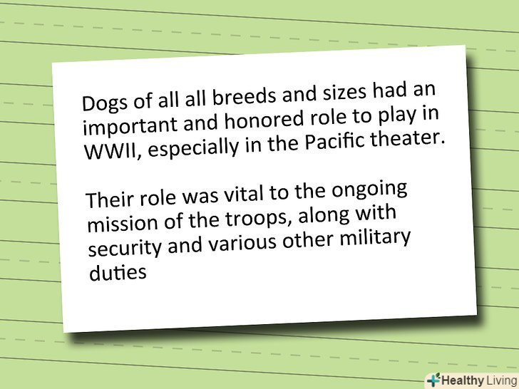 Починайте кожен абзац з пропозиції (topic sentence), в якому міститься якесь загальне заяву по темі.така пропозиція містить тему і основну ідею всього абзацу.[4] воно повинно містити підтверджуючі докази, які розвивають тезове твердження і, якщо ви згадали основні ідеї у вашому вступі, воно повинно бути безпосередньо пов'язане з однією з цих основних ідей.- Наприклад, якщо ви пишете описовий нарис про використання собак морською піхотою США під час Другої світової війни, вашим topic sentence може бути щось на зразок цього: