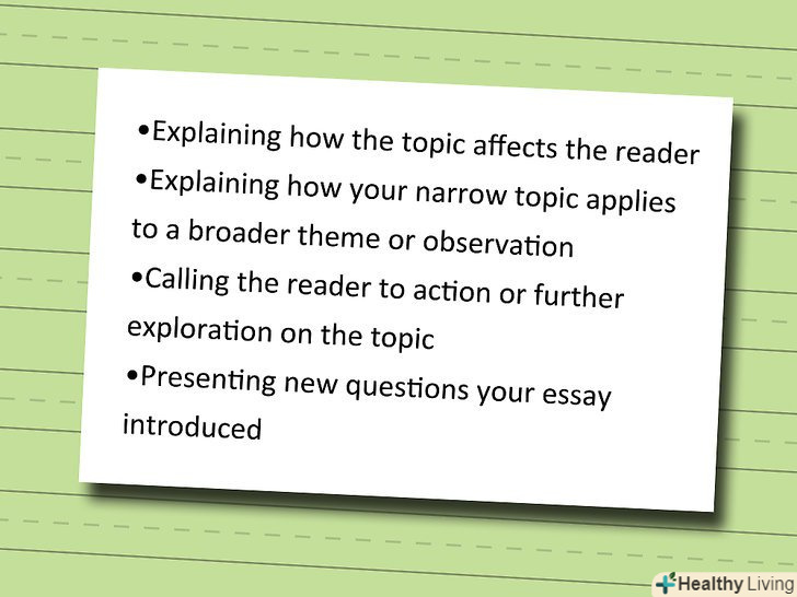 Запропонуйте основну думку або заклик до дії.останнє речення вашого заключного абзацу - і вашого описового есе в цілому-повинно містити одне остаточне твердження по темі вашої роботи.[5]- В якості основної думки розгляньте наступні варіанти: